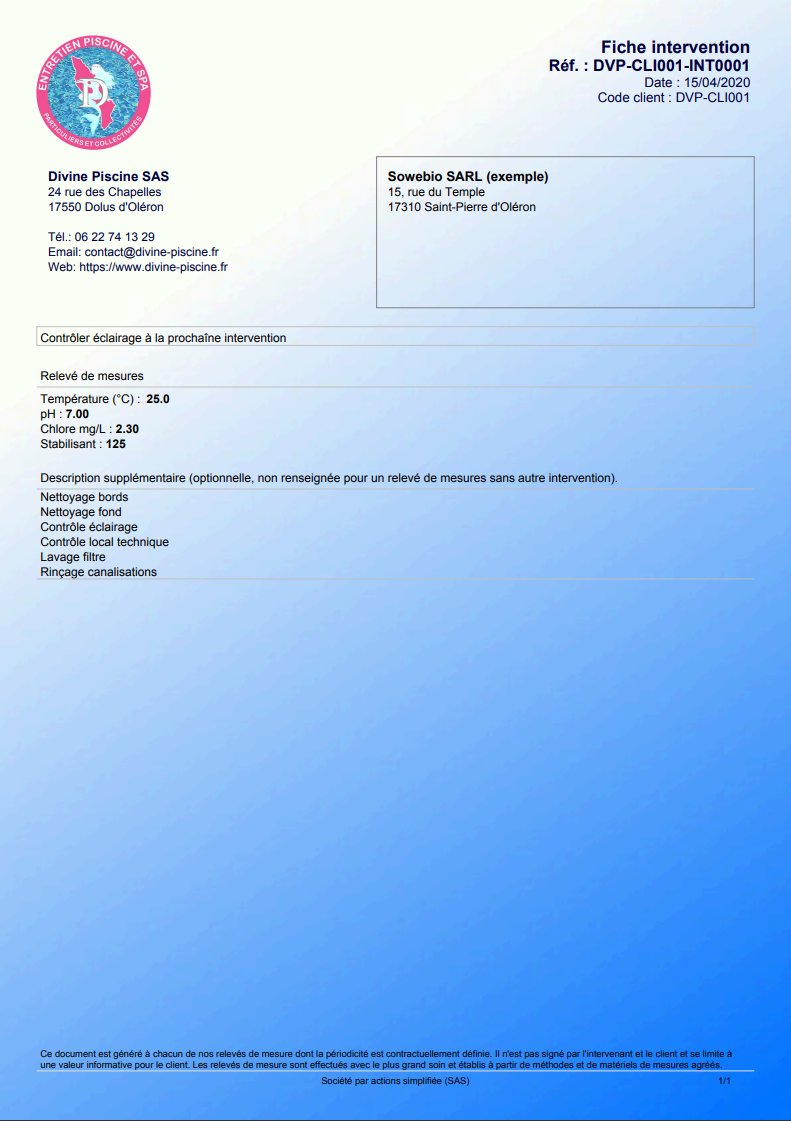 Vous pourrez également visualiser l’historique des visites avec les dates et l’ensemble des mesures. Ainsi ou que vous soyez, vous pourrez suivre l’évolution de votre bassin.
